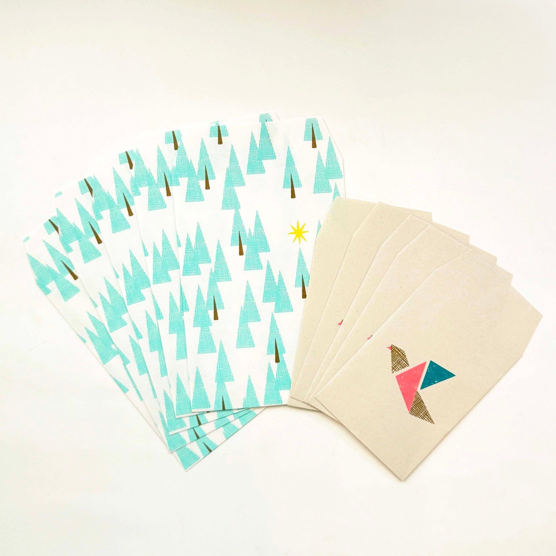 These envelopes feature Mizushima's well-known forest motif and a bird motif that looks like it was folded with origami paper.