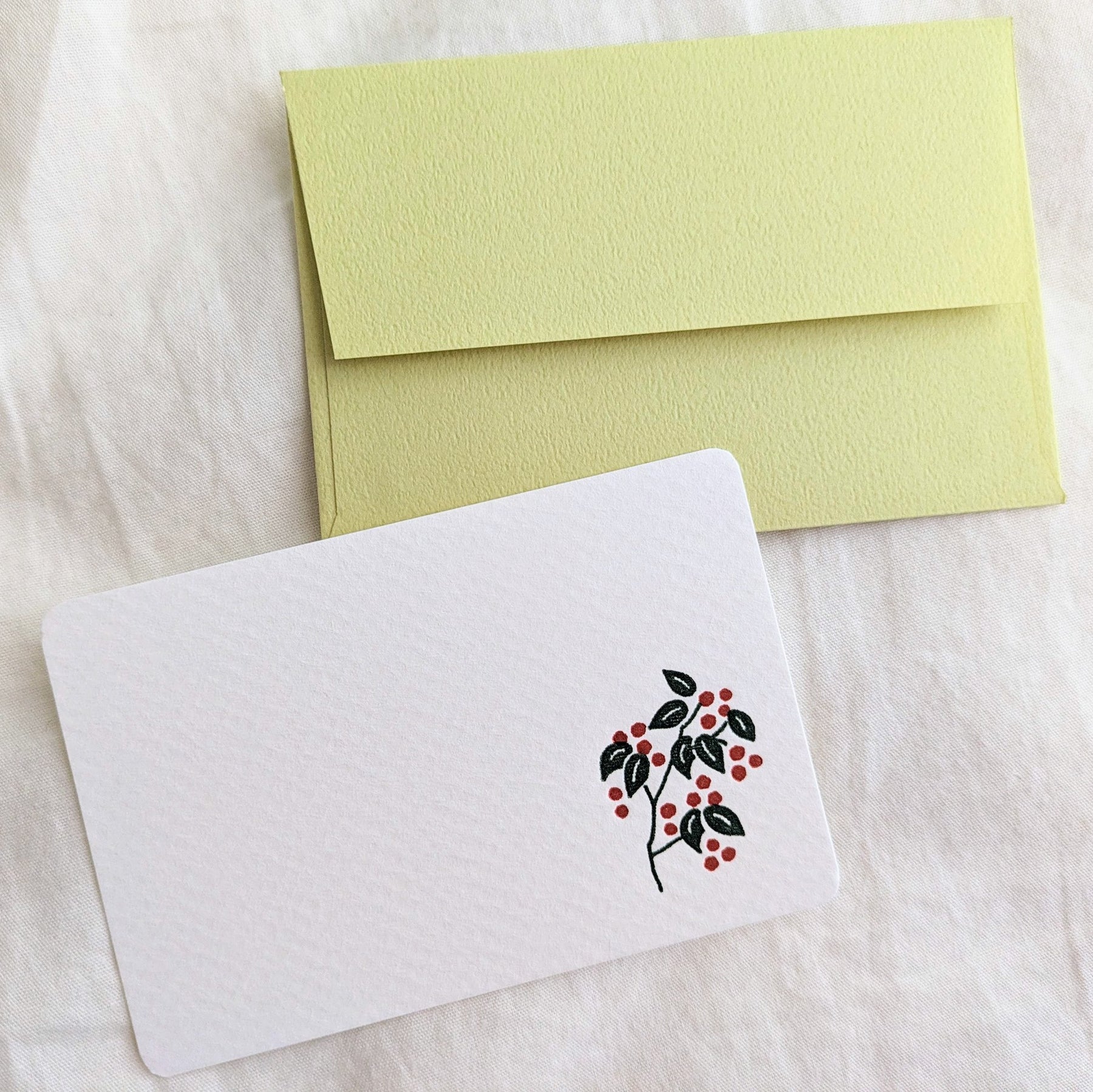 The mini cards "checkerberry" are letterpress printed in two colors and contain envelopes in colors that match the image of the flowers.