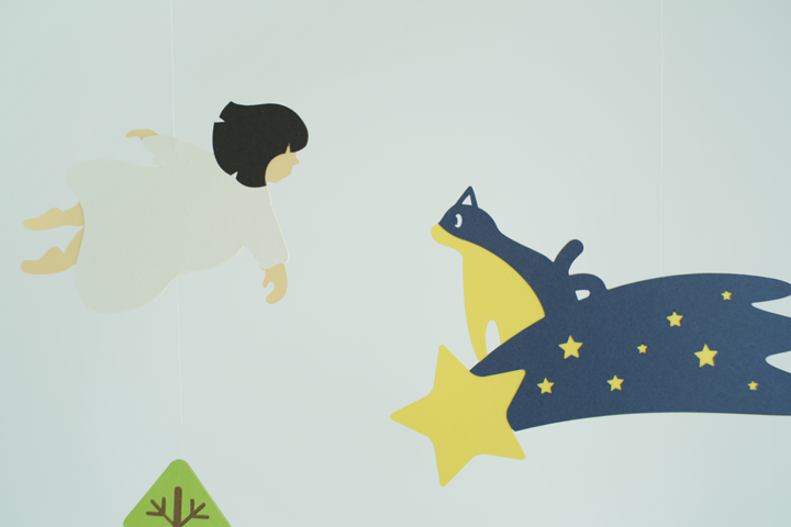 What makes them a little different from most mobiles is that they are made of only paper and thread, without the "sticks" that support the parts.