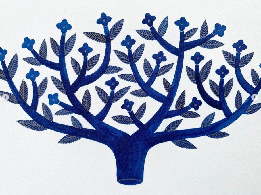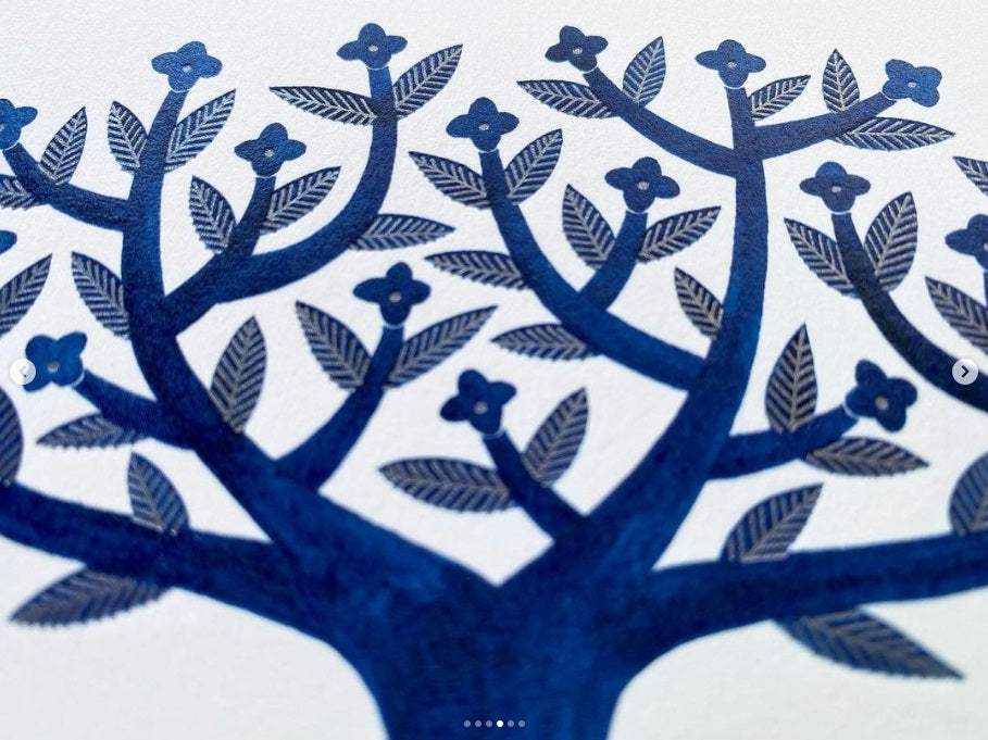 The blue watercolor portion is printed in full color, and the silver ink pen portion is letterpress printed.