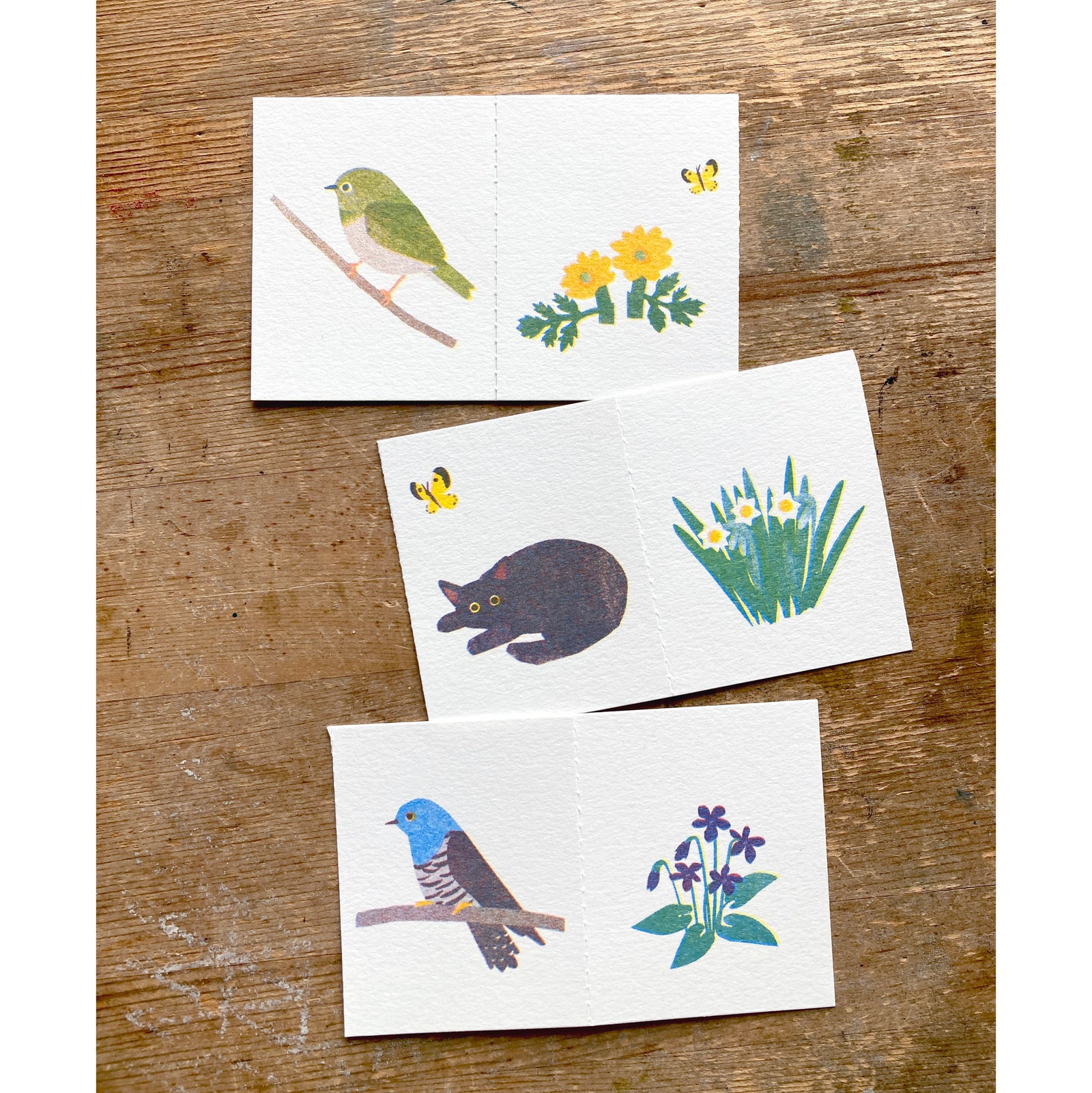 Bellows fold cards created by Itsuko Naka, a popular designer in Japan who produces paper and cloth goods with designs based on plants and wild birds.